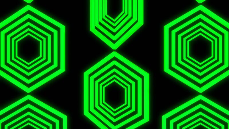 Moving chains with geometric shapes. Design. Neon hexagons move in geometric pattern. Hexagons move and rotate in lines on black background Pro Video