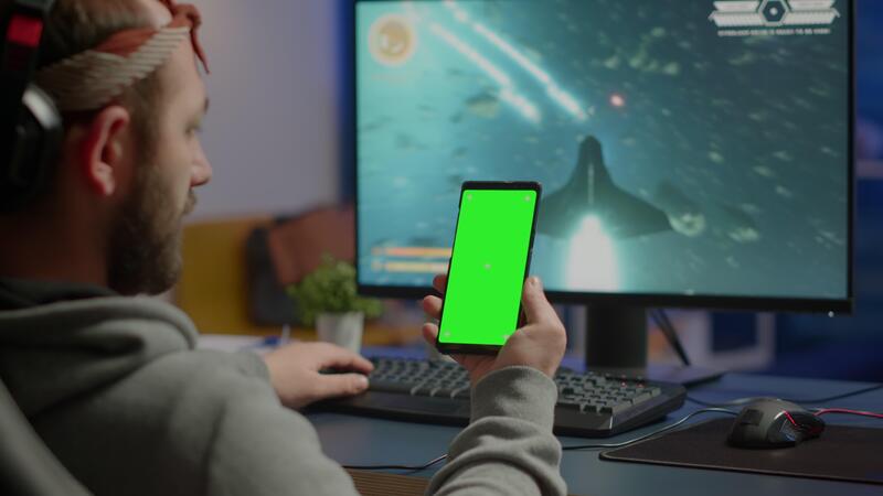 Concentrate gamer holding phone with green screen mock up chorma key display while playing games on powerful computer streaming online competition. Player using isolated desktop playing shooter games Pro Video