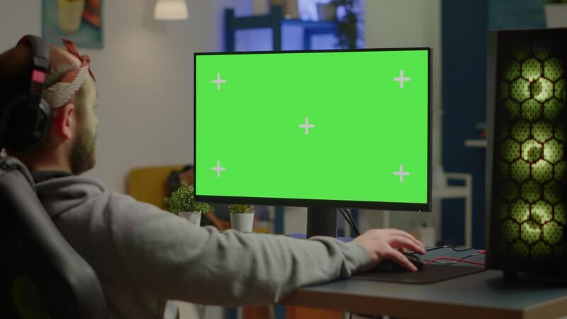 Gamer playing games on powerful computer with green screen chroma key desktop mock-up display in gaming home studio. Player using RGB keyboard with isolated monitor streaming game wearing headset Pro Video
