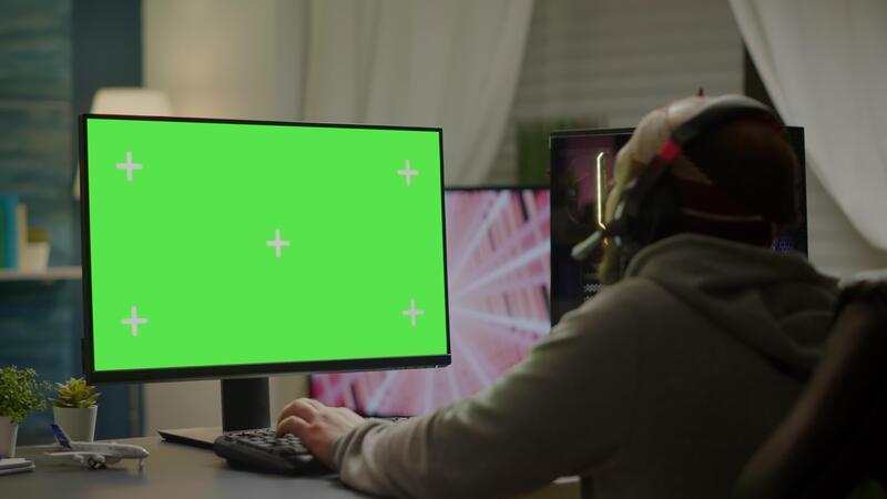Professional cyber gamer playing games with greenscreen, chroma key, mock up desktop isolated display. Player using powerful computer with mockup screen streaming shooter games wearing headset Pro Video