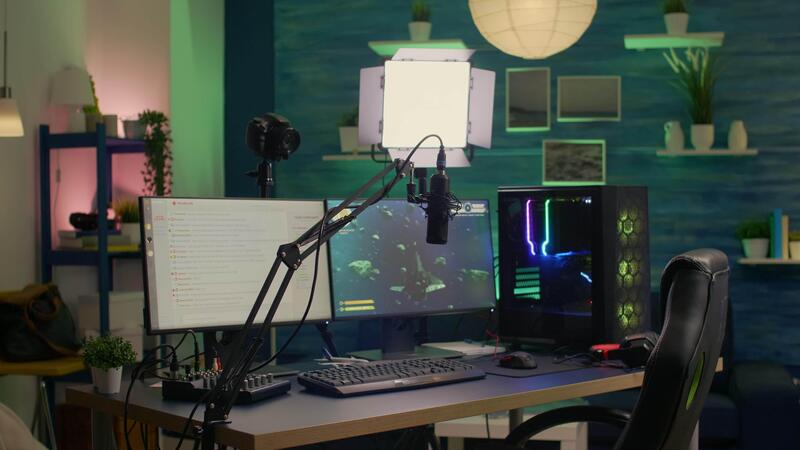 Empty streaming room with professional powerful computer, RGB keyboard and mouse, headphones and mirophone. Player talking with other players on streaming chat during online competition Pro Video