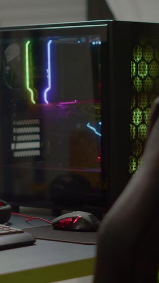 Vertical . RGB powerful personal computer with first-person shooter game on screen in gaming studio with no people at desk. Empty cozy room with modern design is lit with warm and neon light. Pro Video