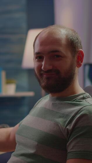 Vertical . Streamer man looking at camera smiling while streaming videogames using stream chat. Pro cyber videogamer playing space shooter game at RGB powerful personal computer in gaming home studio Pro Video