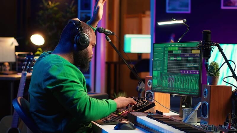 Sound engineer mixing and mastering new music on console and daw software in home studio, twisting pre amp knobs. Talented composer producing songs for the industry. Camera A. Pro Video