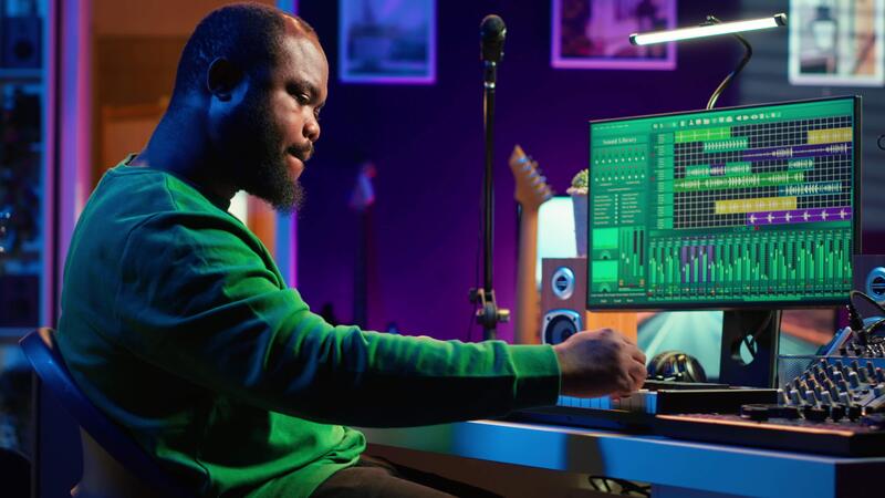 Artist playing piano electronic keyboard and recording new sounds, producing new midi controller notes in his home studio. Audio producer working with digital audio workstation software. Camera A. Pro Video