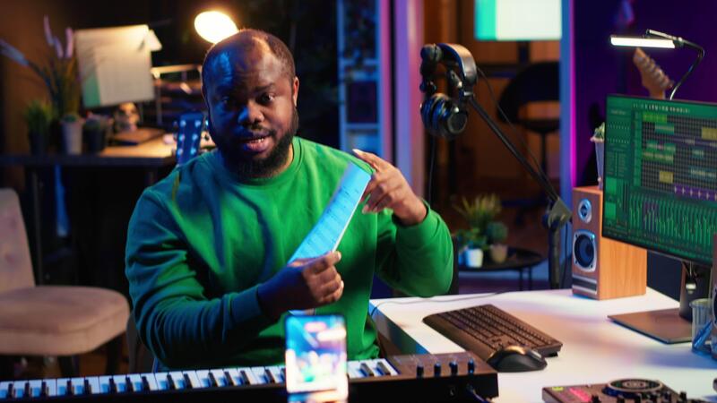 Skilled performer explaining sheet with musical notes on online tutorial, internet lessons in home studio. Producer artist teaching how to read acoustical notation, playing piano. Camera A. Pro Video