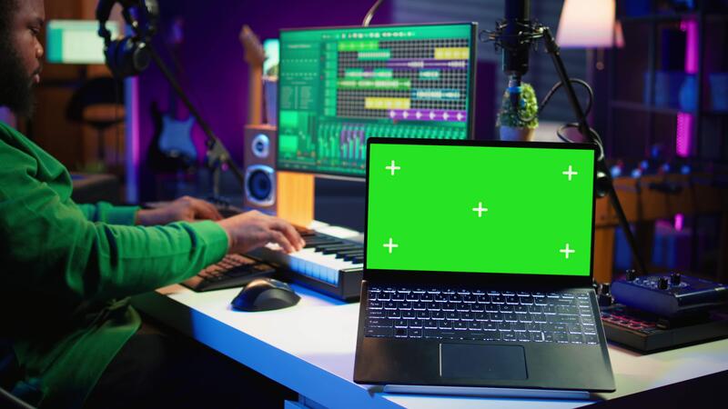 Professional artist operating on daw software in home studio, using a green screen layout next to him. Producer editing his audio recordings by applying mixing and mastering techniques. Camera B. Pro Video