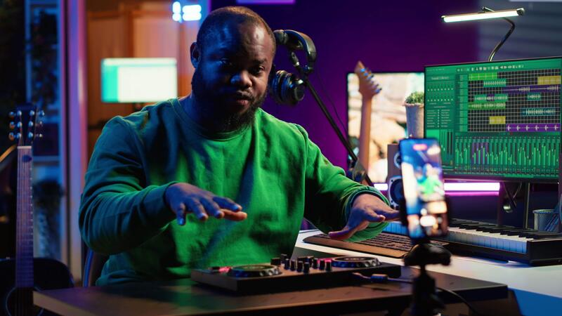 Music producer explaining faders and knobs on mixing console before teaching advanced post production stuff. Musical instructor gives advice about acoustical engineering, online vlog. Camera A. Pro Video