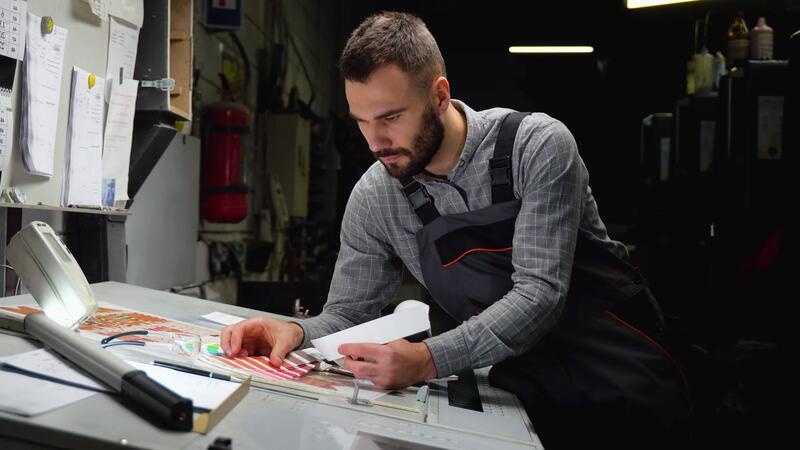 Designer selects proper color from swatch palette for promotion. Design and art concept Pro Video