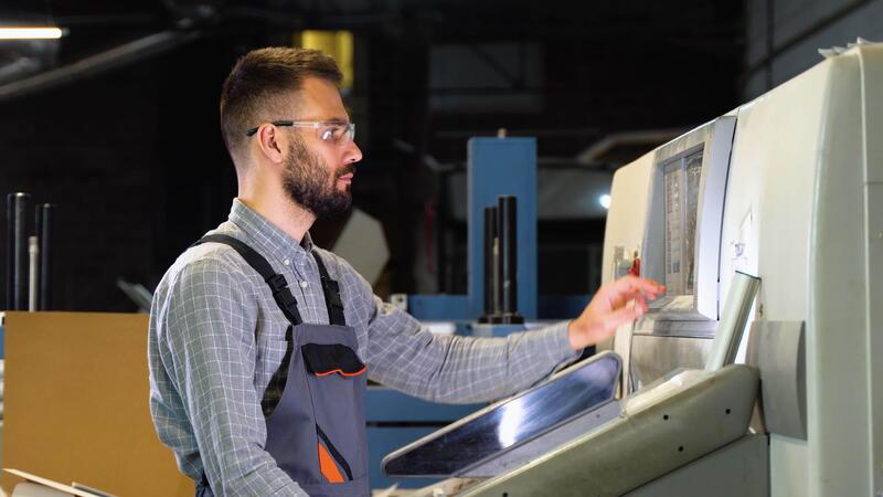 Technician operator checking input and output status on touchscreen front display monitor station in digital printshop office Pro Video
