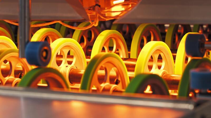 Close-up view of the massive wheels within a manufacturing machine on an assembly line within a factory workshop. Pro Video