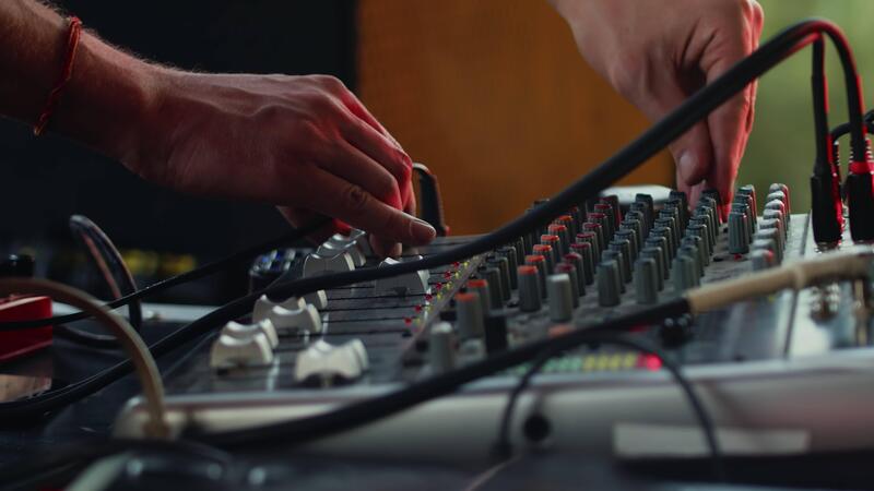 Sound engineer adjusting the settings on the mixing console during the daytime music performance, moving knobs and faders with the hands close up Pro Video