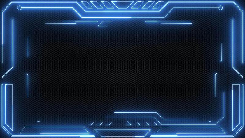 HUD frame element technology background with a border of blue neon light beams on black mesh texture. This tech border UI viewfinder animation is full HD and looping. Free Video
