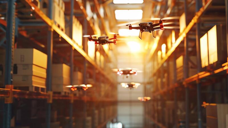 Smart warehouse with robotic drones scanning and organizing inventory from above. Smart factory automation Free Video