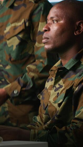 Vertical Soldier in military HQ base doing brainstorming with coworker, gathering information on enemy troops. Teamworking officers using tracking software to do assessment of enemy vulnerabilities, camera A Pro Video