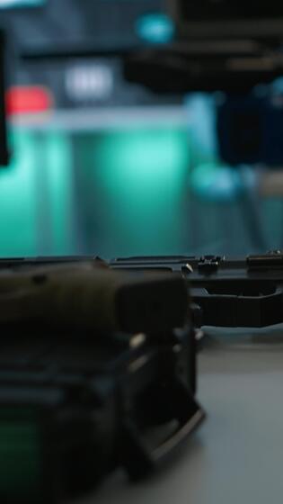 Vertical Weapons on table in secure room in army governmental facility operating as military command post and surveillance monitoring center. Extreme close up of guns in empty military base of operations Pro Video