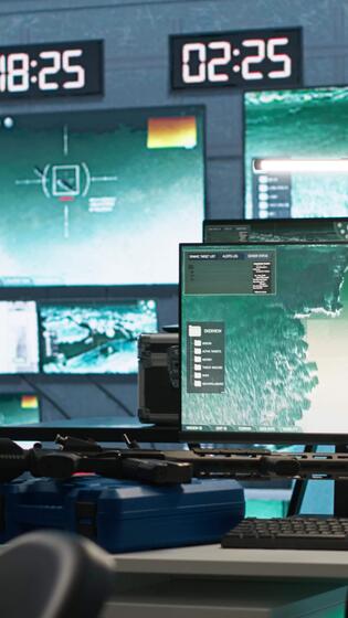 Vertical Secure room in army governmental facility operating as military command post and surveillance monitoring center, filled with digital equipment. Empty military base of operations with radar systems Pro Video