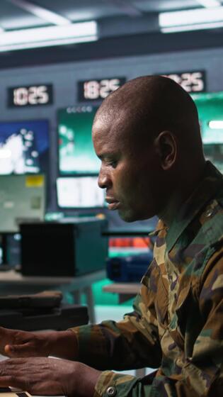 Vertical Army software developer employing AI tech in military planning and decision making. African american IT specialist uses artificial intelligence to enhance combat operational capabilities, camera B Pro Video