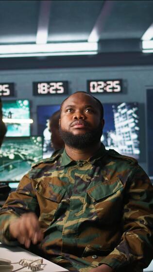 Vertical Military officer using augmented reality tracking tech to gain info helpful against enemies. Army expert using AR hologram to gain intel helping troops, coordinating mission activities, camera B Pro Video