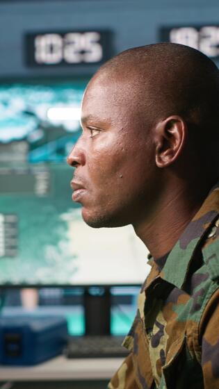 Vertical Portrait of military agent working in control room, analyzing aerial reconnaissance data. Intelligence corps agent controlling drones attacking strategic targets, camera A Pro Video