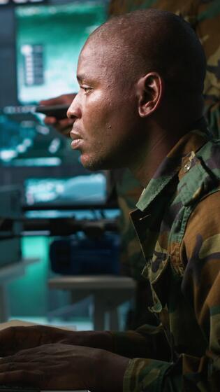 Vertical Military dispatcher helped by coworker with tablet to gain info from army intelligence analysts. Army intelligence corps expert discussing with colleague in command post, camera A Pro Video