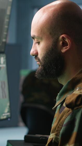 Vertical Army computer scientist employing AI technology in military planning and decision making processes. Expert uses artificial intelligence to enhance armed forces operational capabilities, camera A Pro Video