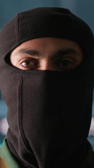 Vertical Portrait of terrorist loading gun, attacking enemy command center. Close up of masked insurgent reloading pistol during enemy base assault hijacking in guerilla warfare armed conflict, camera A Pro Video