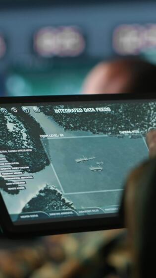 Vertical Military agent working in control room, using software on tablet, analyzing aerial reconnaissance data. Close up of intelligence corps expert controlling drones with portable device, camera A Pro Video