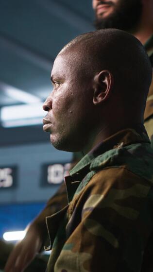 Vertical Team of army telecommunications operators using radio and satellite gear, cooperating to provide combat support. Teamworking military dispatchers colleagues managing communications networks, camera A Pro Video