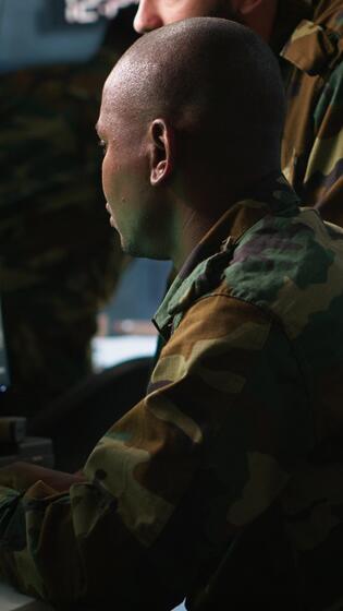 Vertical Army telecommunications operators using radio and satellite gear, inputting data on systems. Military dispatchers managing communications networks, typing on keyboard, camera A Pro Video