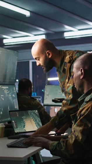 Vertical Military soldier in mission control center, overseeing national safety operations using notebook next to colleague. Team of army specialists examining data in monitoring room command center, camera B Pro Video