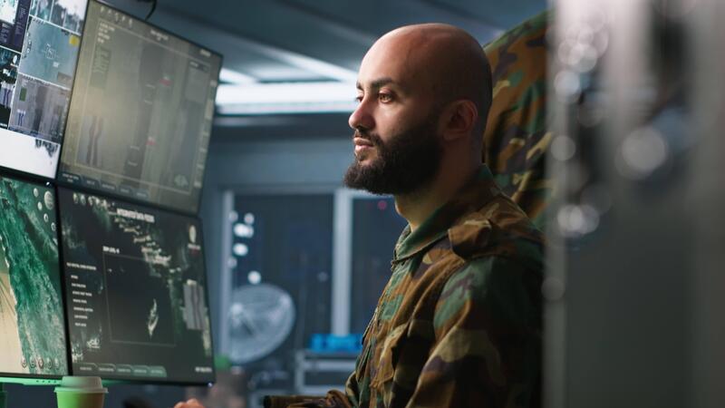 Military agent working in control room, analyzing aerial reconnaissance data. Intelligence corps agent controlling drones attacking strategic targets, camera A Pro Video