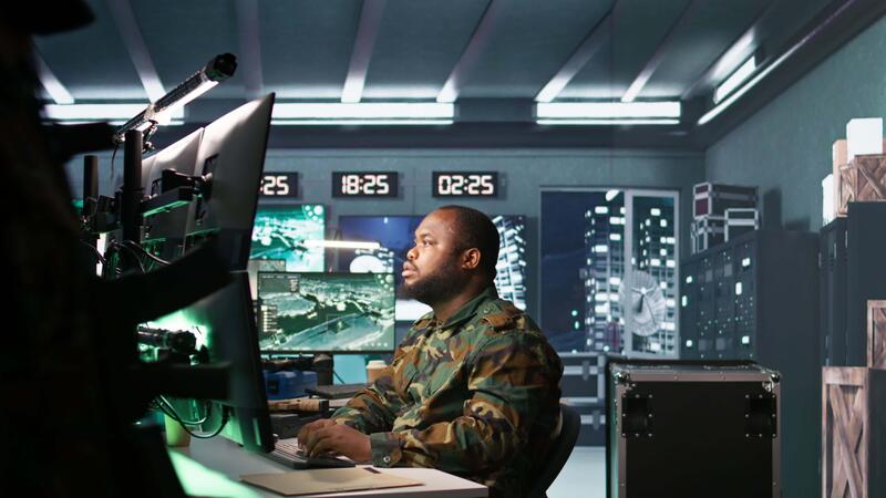 Army expert working in governmental facility operating surveillance tech, evaluating target data. Soldier doing job in HQ base of operations, engage enemy forces, camera B Pro Video