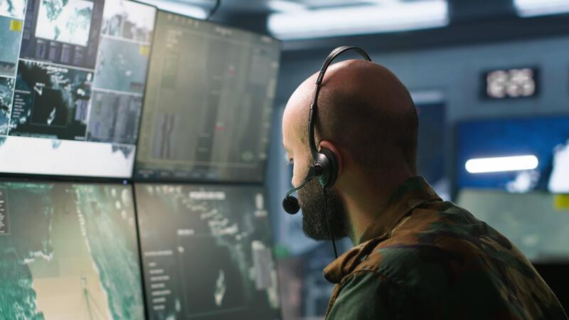 Army telecommunication systems operator using radio and satellite equipment. Middle Eastern military dispatcher managing communications networks, looking at screens, camera A Pro Video