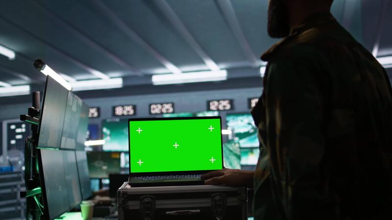 Army specialist working in war room operating surveillance tech, evaluating target data on isolated screen laptop. Soldier engaging enemy forces using chroma key notebook, camera B Pro Video