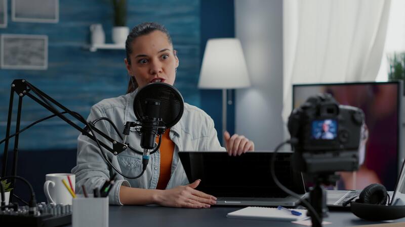 Review show host reviewing high tech laptop while recording . Popular internet influencer filming recommendation vlog for portable computer while presenting specifications. Pro Video