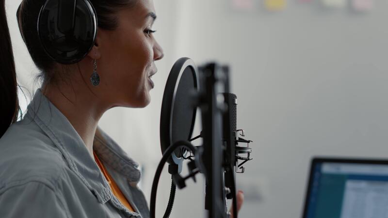 Smiling influencer broadcasting internet talk show while speaking to public. Popular social media content creator talking to public on microphone while streaming podcast. Pro Video