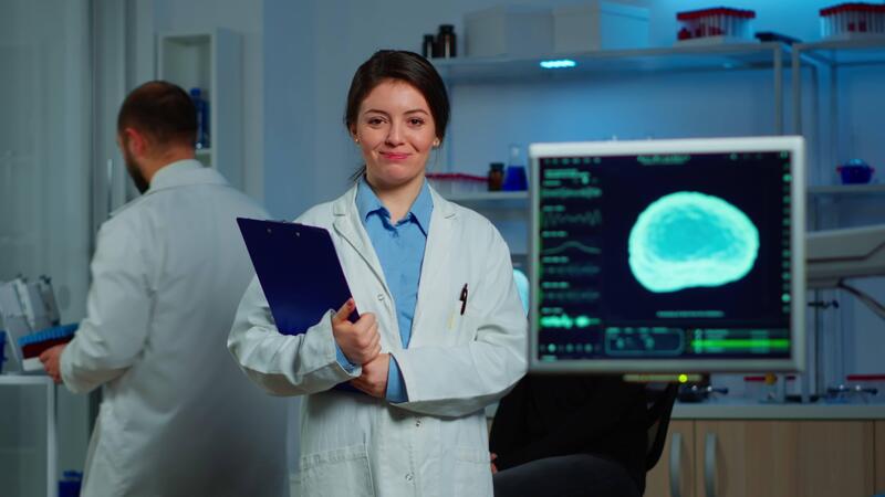 Portrait of scientist neurologist researcher looking at camera smiling while coworker discussing with patient in background about brain functions, nervous system, tomography scan working in laboratory Pro Video