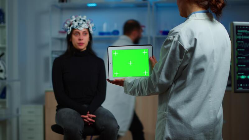 Neurologist doctor holding tablet with green screen in neurological research laboratory. Scientist using mockup chroma key display isolated desktop while patient with eeg headset wating in background Pro Video
