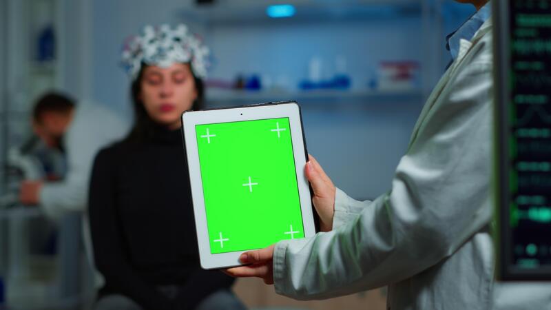Health care researcher holding and looking at tablet with chroma key display in neurological lab. Team of scientists doing medical research reading on device with green screen, isolated mockup display Pro Video