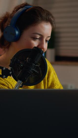 Vertical . Happy blogger reading messages of fans using smartphone sitting in home podcast studio during livestreaming, recording. Online show On-air production internet broadcast host streaming live content Pro Video