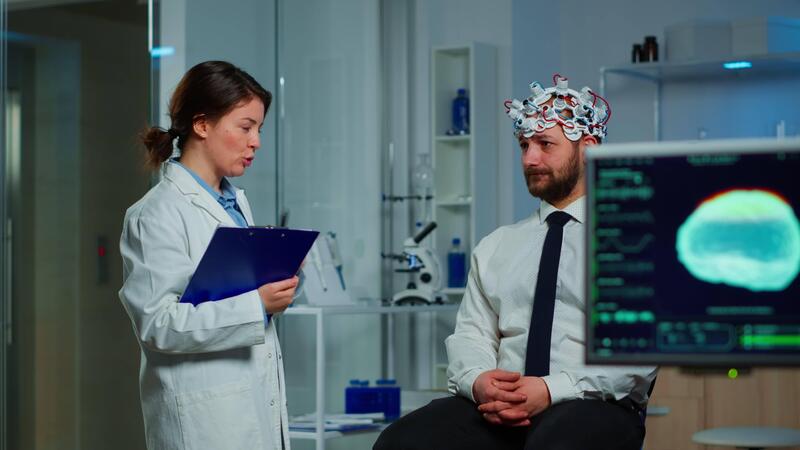 Man sitting on neurological chair with brainwave scanning headset while researcher examining health status writing on clipboard. Doctors working in brain study lab with monitors showing EEG reading. Pro Video