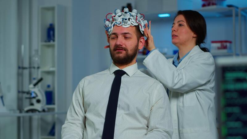 Neurologist doctor analysing brain of man and nervous system using brainwave scanning headset. Researcher using high tech developing neurological innovation monitoring side effects on monitor screen Pro Video