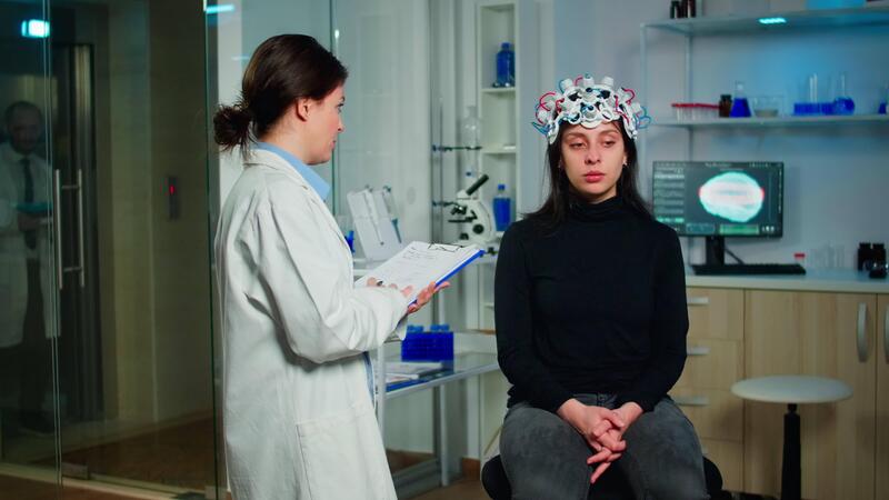Neurologist doctor asking symptoms of patient taking notes on clipboard, adjusting high tech brain scanner. Medical scientist controlling EEG headset analyzing brain functions and health status Pro Video