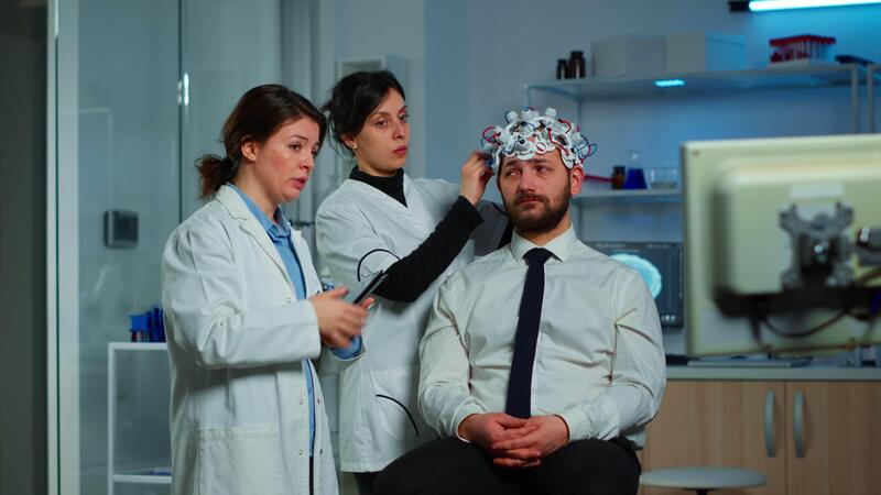 Neurological researchers explaning treatment result pointing on monitor while medical scientist adjusting brainwave scanning headset preparing for brain scan analysing electrical activity Pro Video
