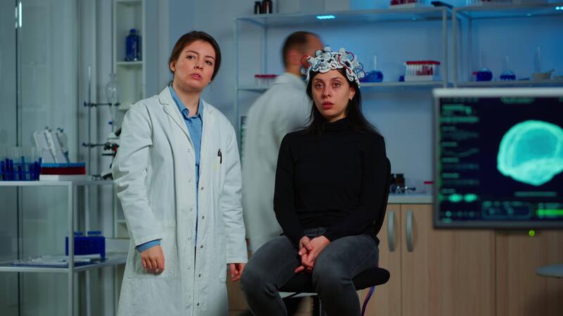 Researcher and patient with eeg headset looking at virtual display with touchscreen, virtual reality using medical inovation in neurological research lab. Scientists working with healthcare simulator Pro Video
