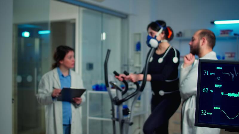 Sportswoman running with mask on cross trainer with electrodes attached to body. Physician using tablet computer and controls EKG data showing on laboratory monitors, discussing with patient Pro Video