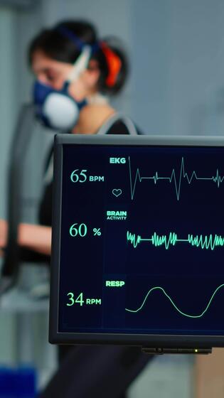 Vertical . Medical researcher examining EKG image showing on monitor while patinet with mask running on cross trainer testing heart rate using electrodes.Doctor monitoring physical endurance in science sport lab Pro Video