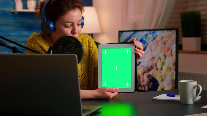 Influencer holding tablet with green screen and speaking into microphone during podcast in home studio. On-air production internet broadcast host streaming live content using chroma key mockup display Pro Video