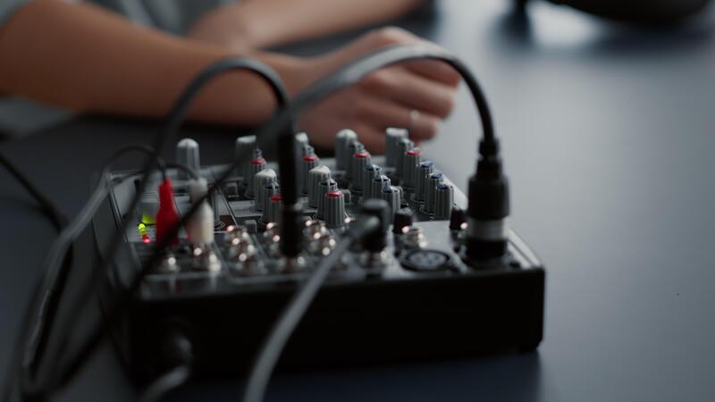 Woman tweaking audio mixer knobs and buttons. Internet radio host changing volumes and using studio sound console equalizer to improve broadcast audio quality. Close up shoot Pro Video